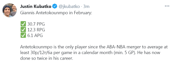 第三,这场比赛是当地时间2月28日进行,是雄鹿2月份的最后一战。字母哥打完这场比赛后,2月份的数据是场均30.7分12.3篮板6.1助攻,他是NBA和ABA合并以来唯一一位单月场均至少30+12+6的球员(至少打5场)。生涯至今,这是字母哥第二次做到。