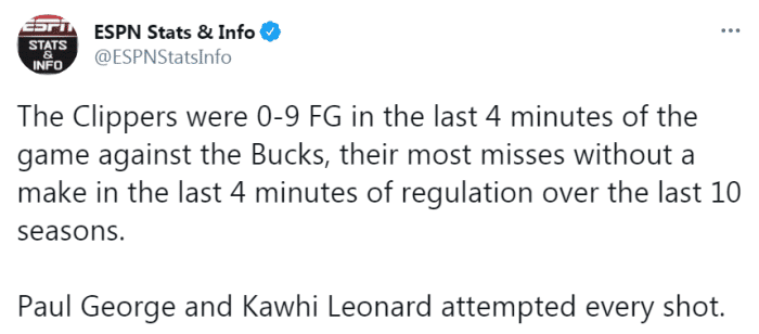 一边是字母哥的里程碑,另一边则是小卡和乔治的耻辱柱。数据显示,在这场比赛的最后4分钟,快船全队9投0中。这也是快船在近10年以来比赛最后4分钟没有命中的前提下投失球最多的一次。小卡和乔治包揽了今天最后的9次投篮,关键时刻,快船的双核表现糟糕,葬送了一场胜利。