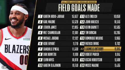 向来很甜的安东尼看到好基友詹姆斯,发挥有些失常,投篮7中2贡献4分2篮板3助攻1抢断2盖帽。其中这2球,让安东尼生涯运动战进球数来到9615次,超越“酋长”罗伯特-帕里什,升至NBA历史进球榜第17位,下一位要超越的对象是帕特里克-尤因(9702)。