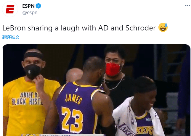 当然,詹姆斯作为球队的核心球员,此役28分11板7助4断3帽的表现,也足够劲爆。比赛进行到第四节,当湖人已经领先两位数,詹姆斯在场边也是喜笑颜开。他和身着便装观战的浓眉以及披着毛巾的施罗德交流着什么,随后3人都哈哈大笑,场面非常轻松。在4连败期间,湖人没有这样的场面。