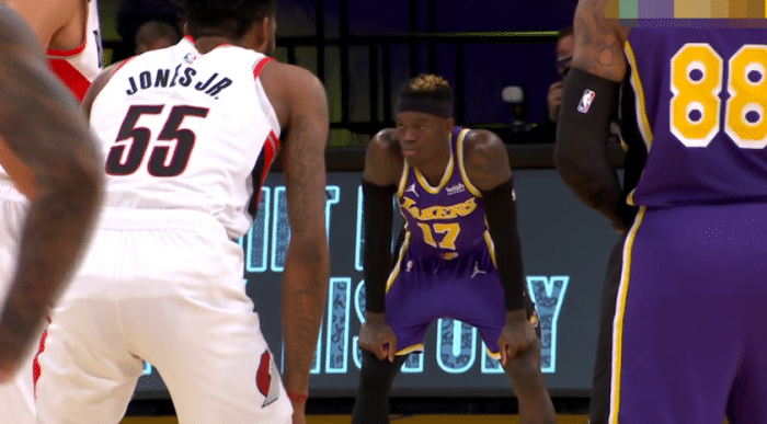 比赛正式开打后,湖人开场糟糕,不仅进攻不佳而且失误不断,詹姆斯开场第一次强打被吹走步违例,施罗德投篮打铁还被特伦特抢断反击,湖人开场被打15-4,大莫里斯内线强攻止血,詹姆斯空中大帽扇飞科温顿,23号大帽23号,然后老詹持球反击上篮得分。
