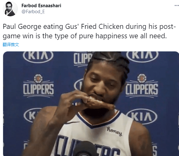 快船复仇灰熊赛后,30岁乔治接受采访时,一边吃东西一边回答记者的问题,甚至拿起鸡腿大口吃起来,在采访现场当众大口吃肉,看来乔治真的累饿了,当然也可能是赢球心情好,想吃就吃了;快船记者调侃,快船赢球后乔治狂吃炸鸡,这就是所有人都需要的那种最纯粹的幸福。