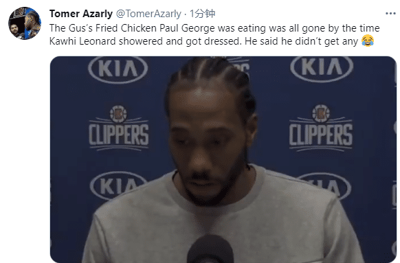 等到小卡洗好澡并换好衣服接受采访时,小卡表示乔治吃光了炸鸡,他什么都没有吃到;小卡全程面无表情,快船两大两袖太有趣了。