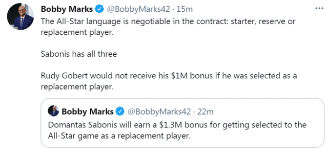 不过,不是每一个球星的合同都有类似待遇。比如鲁迪-戈贝尔,他成为全明星替补后也获得100万奖金,但如果他是顶替入选,就没有这份奖金。