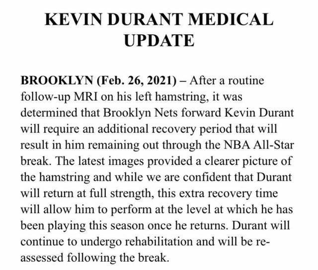 篮网在官方声明中写道:“最新的核磁共振检查结果,让球队对杜兰特的腿筋伤势更加了解。虽然我们对杜兰特完全康复并复出非常有信心,但额外的恢复时间有助于他回归他之前的比赛水准。杜兰特会继续接受恢复治疗,并在全明星之后接受复查。”