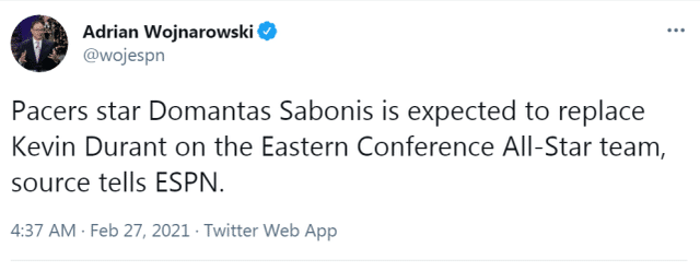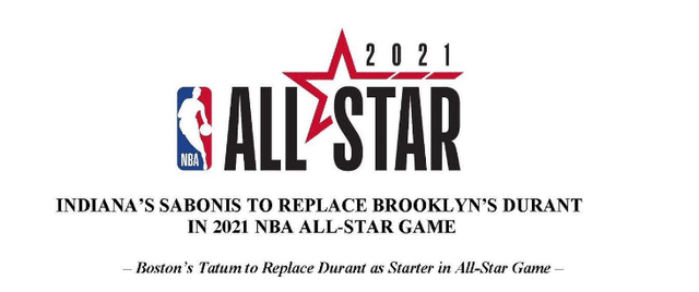 来源:直播车02-27 10:20直播车讯北京时间2月27日,篮网官方宣布,凯文-杜兰特因左腿筋伤势需要更多恢复时间,将缺席本赛季的全明星正赛。随后,NBA官方宣布,步行者球星小萨博尼斯将顶替受伤的杜兰特,入选东部全明星阵容,杜兰特的全明星首发位置,由绿军的塔图姆替代。