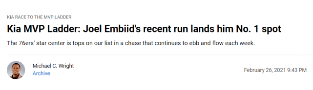 官网更新MVP排行榜!恩比德超詹姆斯升至第一,哈登仍在第十引争议