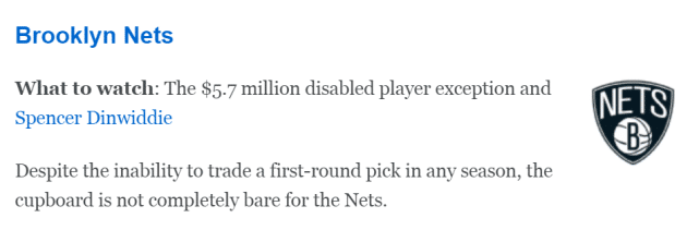 值得注意的一点是这个特例还不能和球员打包使用。举个例子,篮网不能用这个特例加上沙梅特,去换一个本赛季薪水770万的球员。如果丁威迪在3月25日交易截止日前被送走,这个特例也自动作废。