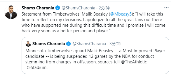 来源:直播车02-26 15:29直播车2月26日讯 北京时间2月26日,NBA正式开出一笔重大罚单,据名记shams报道,森林狼后卫马利克-比斯利因休赛期的指控被联盟禁赛12场比赛,他是本赛季最快进步球员奖的候选人,可因为场外的原因,他已经被联盟禁赛12场,目前比斯利已经发表声明。