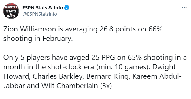 根据统计,锡安在2月的场均得分来到26.8分,而命中率高达66%。在进入24秒计时一以来,NBA此前仅有5人能够做到在单一自然月内至少10场比赛,用超过65%的命中率轰出场均25+的得分,分别是霍华德、巴克利、伯纳德金、贾巴尔和张伯伦。如今,锡安在2月的12场比赛中,打出了这一数据。如果继续保持,他将加入这一行列。
