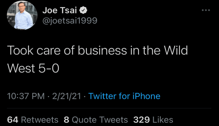 很快篮网老板蔡崇信就更新社交媒体,他表示:“5-0拿下狂野西部。”