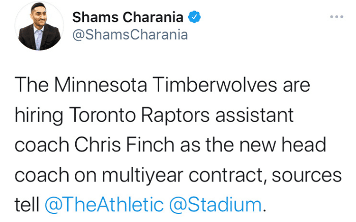 来源:直播车02-22 18:37直播车讯 北京时间2月22日,NBA西部球队森林狼传来更换主帅的消息,这是他们的官方消息显示,球队正式解雇主教练小桑德斯,本赛季的小桑德斯带队战绩不佳,近期处于4连败中,整体的战绩是7胜24负,排名联盟垫底。很快根据The Athletic名记Shams报道,森林狼将聘请猛龙助教克里斯-芬奇担任新主帅,双方签下一份多年合同。