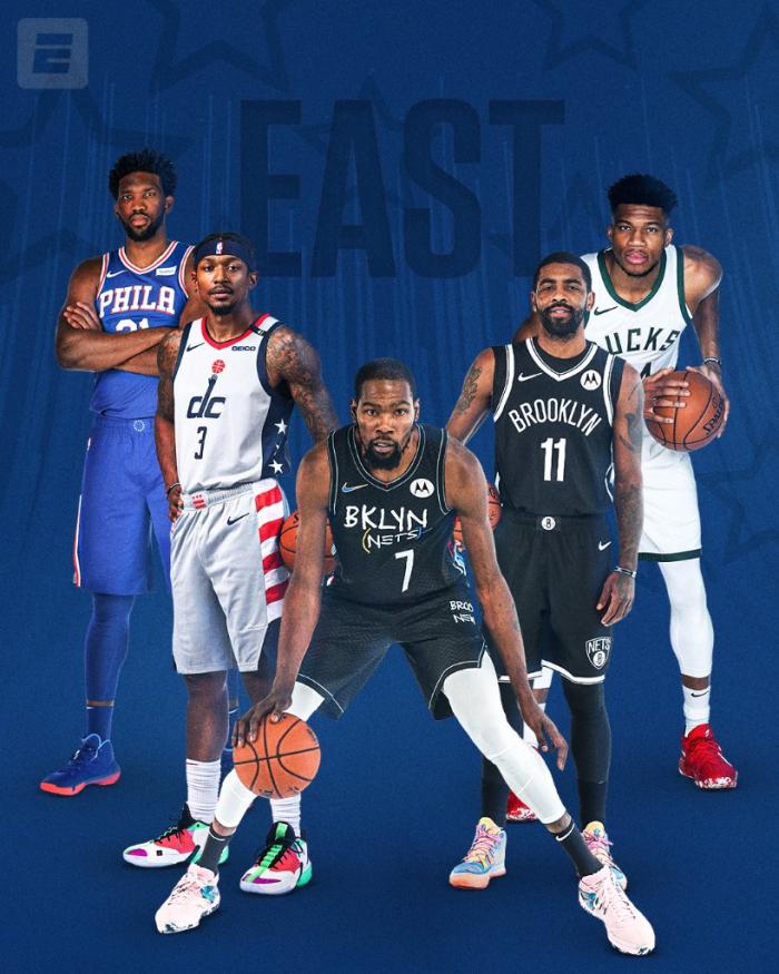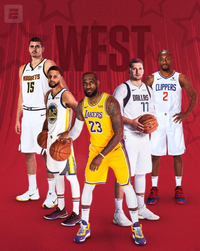 东西部全明星首发阵容已经出炉,西部首发五虎是詹姆斯、约基奇、库里、东契奇和小卡,东部首发是杜兰特、字母哥、恩比德、比尔和欧文;詹姆斯和杜兰特成为各自分区的队长,他们将通过直播选人,票王詹姆斯拥有优先选择权,他很可能在组队时首选库里。