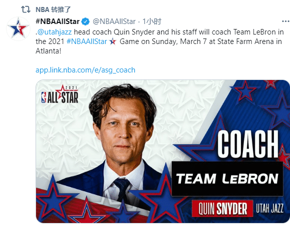 斯奈德已经执教爵士7个赛季了,执教战绩是295胜217负,胜率是57.7%,带领爵士四次杀进季后赛;恭喜斯奈德首次成为全明星主帅,此前他还当选了12月和1月西部月最佳主帅。