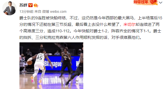 苏群也盛赞米切尔和爵士的发挥:爵士队的9连胜被快船终结,不过,这仍然是今年西部的最大黑马,上半场落后15分的情况下还能在第三节反超,最后看上去没什么希望了,米切尔却连续进了两个高难度三分,追成110-112。今年快船对爵士1-2,阵容齐全的情况下1-1。爵士的挡拆、三分和克拉克森第六人作用顺利发挥的话,对手很难赢他们。