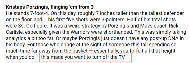Shaun Powell质疑波尔津吉斯的身体里也许根本没有背身单打的DNA,才让他的投篮总是远离篮下。“这让你想关掉电视,”Shaun Powell写道。