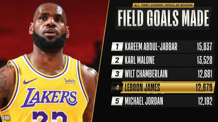 随着詹姆斯命中本场第3个运动战进球,常规赛总进球数达到12682个,从而正式超越上古神兽张伯伦(12681个)成为此项纪录历史第三人,目前詹姆斯前面仅剩两位大神——卡尔-马龙13528球和“天勾”贾巴尔15837球,未来有希望超越马龙,但超越贾巴尔的难度很大。
