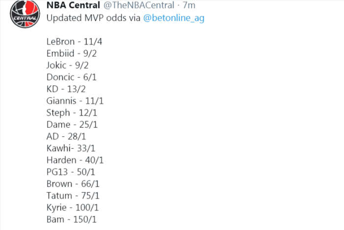 MVP最新赔率出炉!詹姆斯居首约基奇恩比德并列第二,哈登无缘前十