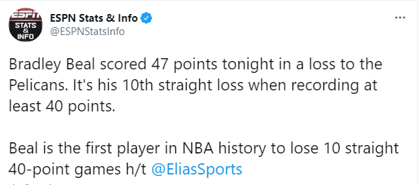 据统计这是比尔生涯第十次轰下40+输球,创扎心纪录,成为NBA史上第一位至少轰下40分连续输掉10场比赛的球员,这纪录太疯狂太尴尬,俨然已经沦为NBA第一空砍帝,本赛季场均34.4分领跑联盟得分榜,可奇才战绩仅仅只有3胜11负,本赛季已经6次单场30+、两次40+和一场60+,经常沦为空砍太扎心。