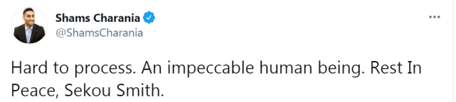 The Athletic名记查拉尼亚写道:“难以接受。一个无可挑剔的人。安息吧,塞古-史密斯。”