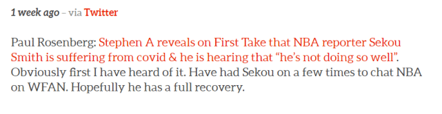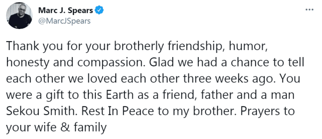 The Undefeated名记马克-斯皮尔斯晒出了一张自己和塞古-史密斯的合影,并写道:“感谢你的兄弟般的友谊、幽默、诚实和同情心。很高兴三周前,我们告知彼此互相欣赏对方。作为一个朋友、父亲和男人,你是上天馈赠于地球的礼物。安息吧,我的兄弟,为你的妻子和家人送上祈祷。”