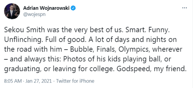 ESPN名记沃纳罗斯基写道:“塞古-史密斯是我们之中最出色的。聪明、幽默、勇敢,都是优秀的品质。和他在一起的日日夜夜——泡泡赛区、总决赛、奥运会,他总会分享他的孩子打球、毕业、离开大学的照片。上帝啊,我的朋友。”