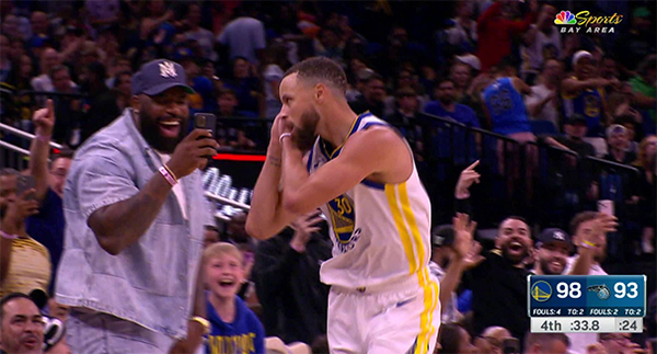 这场比赛的库里在最后时刻实现爆发,首节虽然勇士领先16分,但库里身背两次犯规,被对手重点盯防。库里上半场投篮只有9中2,得到6分1篮板5助攻,三分球3次出手,全部打铁。第三节,库里单节6分。不过到了第四节,库里在最为关键的一分半,通过上篮和三分球,连得5分,直接将分差拉大,做起了晚安安的庆祝动作,直接让一度将分差缩小到1分的魔术绝望。