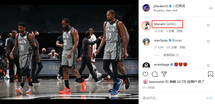哈登还在Ins上晒这张合影,同样没用配任何文字,在评论区我们可以看到,杜兰特的哥哥留言写道:帮派。