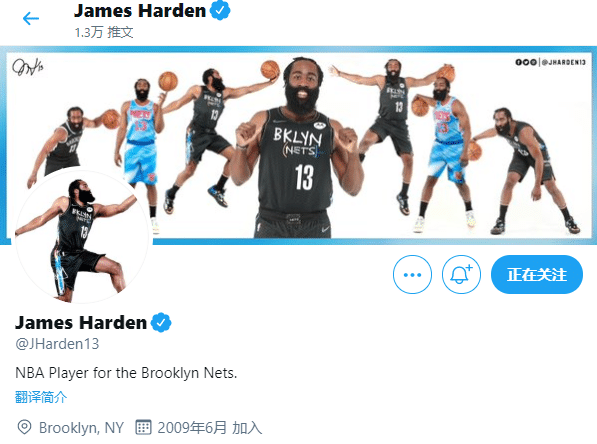 目前哈登推特早已把头像换上身穿篮网13号战袍的照片,简介中写着篮网队的NBA球员;自从被火箭交易之后,哈登为篮网首发主场6场比赛,场均上场40.2分钟轰下23分7.3篮板11.3助攻,得分明显下滑但助攻领跑联盟,有杜兰特和欧文两大帮手,哈登不需要啥都一肩挑,逐渐适应篮网体系的哈登开始露出獠牙。