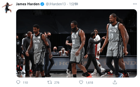 赛后哈登更新社媒媒体,晒出一张篮网三巨头的同框合影比赛照,当时哈登站在C位,和杜兰特、欧文一起下场,小乔丹跟在后面被杜兰特挡住;这是哈登加盟篮网之后第一次晒三巨头同框照,一句话没说,只晒一张合影,球迷在评论区留言。