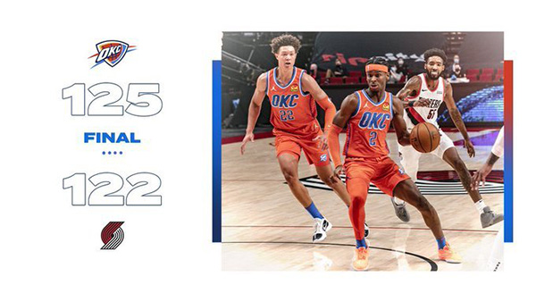 雷霆125-122险胜开拓者 亚历山大24+9+6 利拉德26+6+10