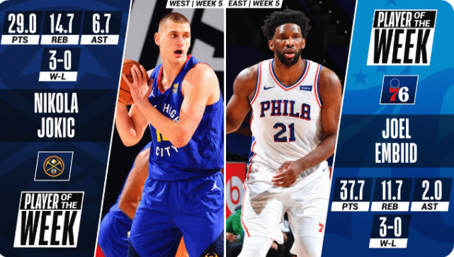 官方公布周最佳球员!恩比德约基奇当选,饼皇场均21+20+6仍无缘