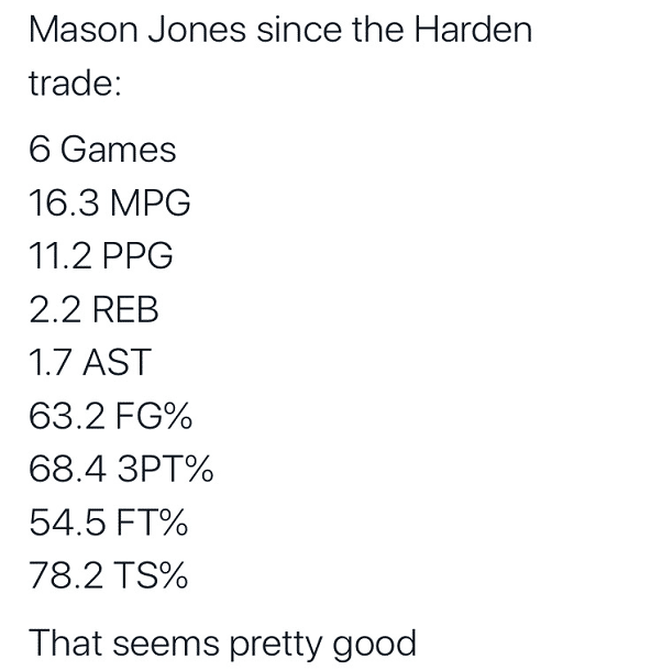 说梅森-琼斯是哈登离队之后的最大赢家并不为过,这点有数据佐证,哈登离开之后火箭进行了6场其中包括首战赢球、3连败和目前的2连胜,梅森-琼斯在这6场比赛中场均虽然只有16分钟的登场时间,但贡献了11.2分2.2个篮板以及1.7次助攻的数据,其中投篮命中率63.2%,三分球命中率68.4%,真实命中率更是高达78.2%!