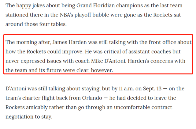 “哈登对于助理教练的选择非常挑剔,但他从来没有提出过任何对于主教练德安东尼的质疑。不过,哈登对于火箭未来的忧虑是显而易见的。”“德安东尼一开始仍然说要留下来,但在第二天9月13日早上11点球队乘坐保级离开奥兰多时,他的想法改变了,他决定离开火箭,而不是去参加一场不太舒服的合同谈判。”