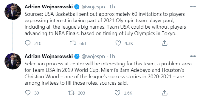 来源:直播车01-24 19:27直播车讯 北京时间1月24日,美国男篮已经开始2021年奥运会的准备工作,他们向大约60名球员发出了邀请,并将在他们之中选出参加东京奥运会的球队阵容。