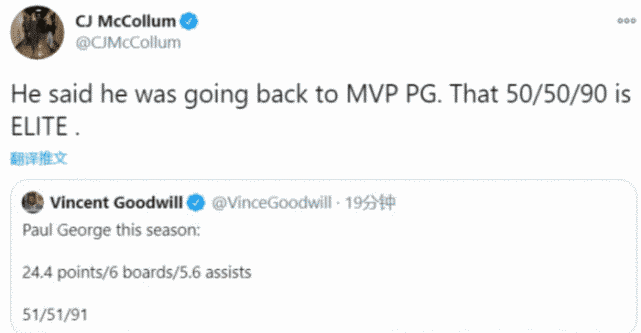 不得不说卢指导的确很善于让队内明星球员信任他,就像当年的詹姆斯一样!当然了,乔治本赛季自己也的确打得很好,截止到现在他场均24.7分6.2板5.5助攻,两分球51.5%,三分球50%,罚球91.8%进入了190俱乐部。开拓者后卫CJ麦克勒莫发推称赞他“他说他要回到那个竞争MVP赛季的乔治,50/50/90真是精英级别的表演。”