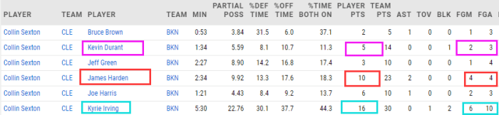 篮网三巨头防守塞克斯顿的具体数据如下: