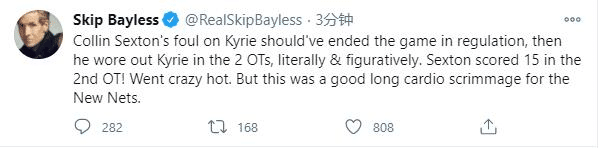 本场比赛结束之后,塞克斯顿的表现、篮网三巨头首秀输球,也是引起了热议。莫兰特、小拉里-南斯、名记马克-斯坦恩都发推盛赞塞克斯顿,表示他开启了“scary hours”,即恐怖的个人表演时间。