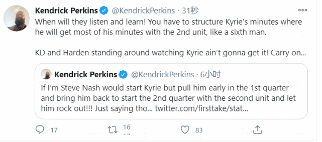 退役后成为评论员的帕金斯,在赛前就表态,如果我是纳什,我会选择将欧文在首节早点换下,然后让他来带动第二阵容。