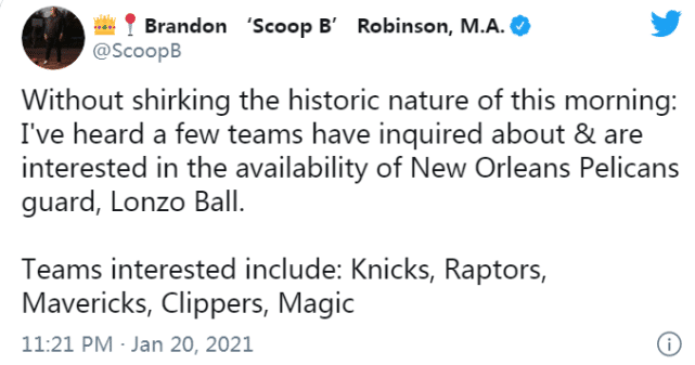 来源:直播车01-21 15:32直播车讯 北京时间1月21日,据NBA记者布兰登-罗宾逊报道,新奥尔良鹈鹕的控卫朗佐-波尔(球哥)引起了不少球队的兴趣,尼克斯、猛龙、独行侠、快船和魔术都已联系鹈鹕,询价球哥,探讨交易他的可能。
