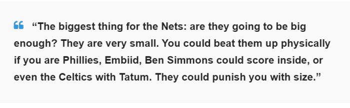 而在名嘴肯尼-史密斯看来,篮网甚至有可能难以冲出东部,更别提在总决赛挑战湖人了。“篮网最关键的问题在于他们是否足够高大?他们的阵容太小了。如果你是费城,你可以用身高优势击败他们,恩比德、西蒙斯都能冲到内线得分,甚至拥有塔图姆的凯尔特人也有机会打败他们。他们可以用块头惩罚你。”