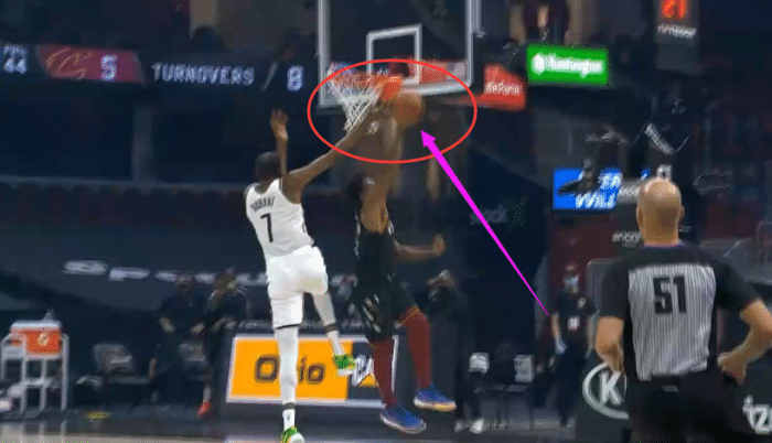第二节6分多钟,篮网防守逼迫骑士传球失误,欧文拿到球后第一时间把球传给快下的杜兰特,杜兰特持球一条龙反击,正在他准备起跳扣篮之时,塞克斯顿眼疾手快直接把球打掉,1米88后卫直接大帽2米08杜兰特;对于死神来说,这本该是一次轻松的扣篮,无奈赛塞克斯顿不放弃,拒绝让杜兰特扣篮,不过斯克斯顿盖帽后飞出底线,球权最终还是篮网的。