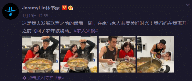 时间过得很快,林书豪马上就要离开家和球队汇合,昨天林书豪更新个人微博表示:“这是我去发展联盟之前的最后一周,在家与家人共度美好时光!……”林书豪晒出了和家人一起在家吃火锅的照片,林书豪和妈妈依偎在一起,火锅内满满一锅诱人的食材,这是“家”的味道,现场一定非常温馨。林书豪这一顿想必是吃爽了,在球队中可吃不到如此美味的火锅。