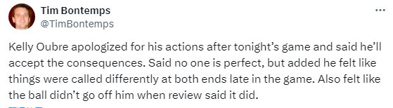 赛后,乌布雷为狂骂裁判的行为而道歉,表示他接受任何后果,并直言没有人是完美的;乌布雷还表示他觉得比赛末尾裁判判罚双方的尺度不同。