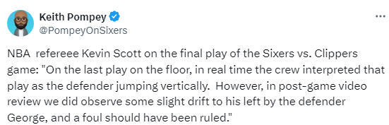 赛后,本场比赛的裁判Kevin Scott承认漏判乔治犯规,Scott表示:在比赛的最后一回合中,裁判组实时地将这个防守动作理解为防守者(乔治)的垂直起跳。然而,在赛后回放中,我们确实观察到防守球员乔治有轻微的向左边的移动,这个球应该吹罚犯规。