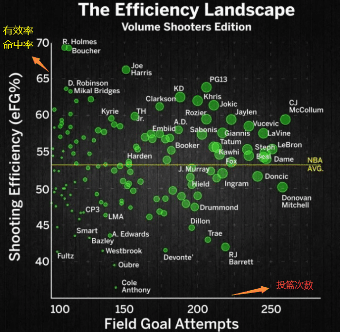 杜兰特在勇士遭遇如此重伤,随后他被交易到篮网,2019-2020整个赛季杜兰特都处在养伤阶段,直到这个赛季杜兰特才宣布复出,本赛季杜兰特复出后的表现可以用势不可挡四个字来形容,最近美国媒体晒出了一张赛季至今投篮效率图,这张图的横轴表示投篮出手数,纵轴表示为有效命中率。杜兰特的位置十分抢眼,堪称是恐怖,一点不像是一个遭遇过跟腱大伤回来的球员,赛季至今11场比赛出手209次得到了337分,你很难想象到这是一个遭遇过重伤球员回归后首个赛季打出的数据。