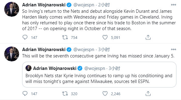 据espn名记报道,由于继续加强体能训练,欧文继续缺席篮网和雄鹿的全美直播,这意味着篮网杜兰特+哈登+欧文的三巨头首秀又要推迟;算上这一场比赛,自从1月6日以来欧文已经连续缺席7场比赛,名记还表示欧文可能会在周四或者周六对阵骑士的比赛中出战,这可能就是篮网三巨头首秀的日子。