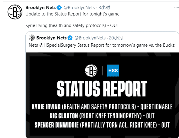 名记爆料欧文缺席比赛是因为长时间缺席比赛导致的体能问题,不过篮网官方为欧文澄清,官宣由于遵守联盟防疫协议,欧文缺席比赛。