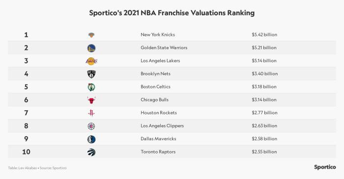 来源:直播车01-19 10:46直播车1月19日讯 知名网站Sportico对2021年NBA球队进行市值评估,一共有3支球队的估值超过50亿美元——尼克斯、勇士和湖人,尼克斯预估市值高达54.2亿美元,依旧是全联盟最值钱的球队,勇士52.1亿美元排名第二,湖人第三篮网第四。