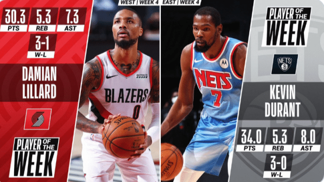 来源:直播车01-19 10:01直播车讯 北京时间1月19日,NBA官方公布了第四周的东西部最佳球员,篮网的凯文-杜兰特和开拓者的达米安-利拉德分别当选。上周,杜兰特帮助篮网取得3胜0负的战绩,利拉德帮助开拓者拿下3胜1负的战绩,独行侠的东契奇虽然有场均30+三双的爆发,但独行侠1胜2负,东契奇也无缘蝉联周最佳。